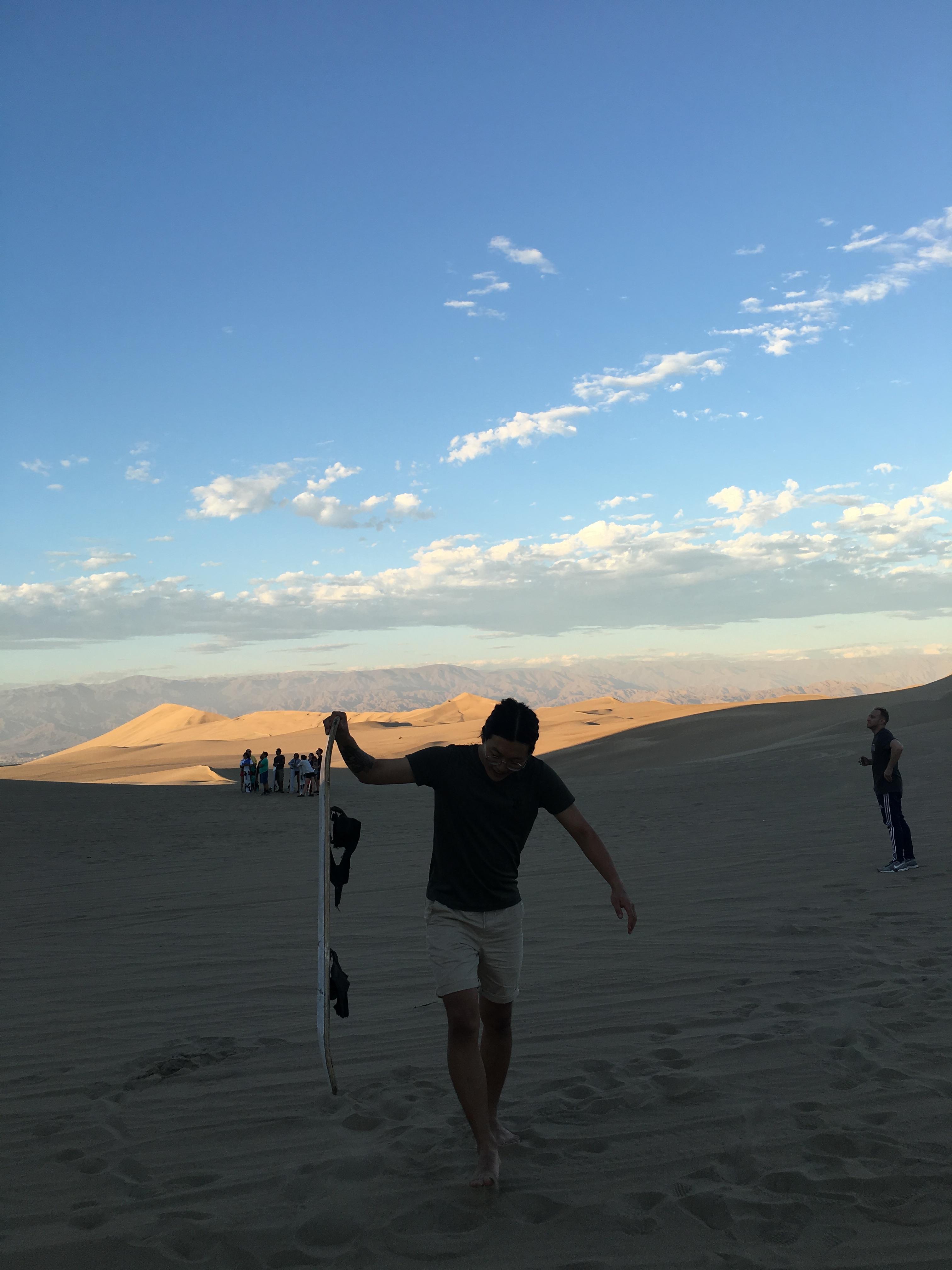 둘째로 샌드보딩입니다. 지금은 광고가 나오지 않지만 제가 갈 때 즈음에 디스커버리사에서 공유를 모델로 한 광고가 있었습니다. 공유가 사막에서 디스커버리 옷을 입고 사구를 보드를 타고 내려가는 광고였는데, 그 샌드보딩을 버기카 투어에서 합니다. 광막한 사막을 쭉 - 달리다가 낙차가 커보이는 사구를 향해 갑니다. 버기카를 정상 부근에 세우고 다들 내려 운전 기사분, 그리고 조수 한 분이 관광객들에게 보드를 나누어줍니다. 스노우보드가 아닌, 서핑보드에 가까운 그런 보드입니다.