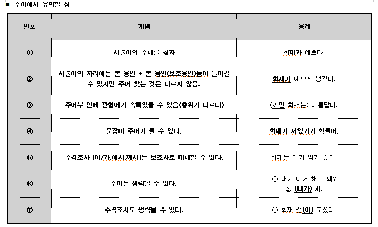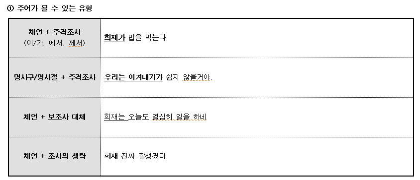저는 개인적으로 단편적이고 단순한. 지리멸렬한 암기를 위한 암기 같은 것들을 굉장히 싫어합니다. 가령 이런 것들을 말합니다. '주어 자리에는 체언 + 이/가, 명사절, 명사구 등이 들어갈 수 있다..' 심플한 것이 가장 좋습니다. 어떤 동작이나 상태, 성질 등의 주체가 주어입니다. 여러분들은 저런 암기보다는 서술어의 주체가 누구인지 찾는 방법이 가장 좋습니다. 예시들어갑니다.